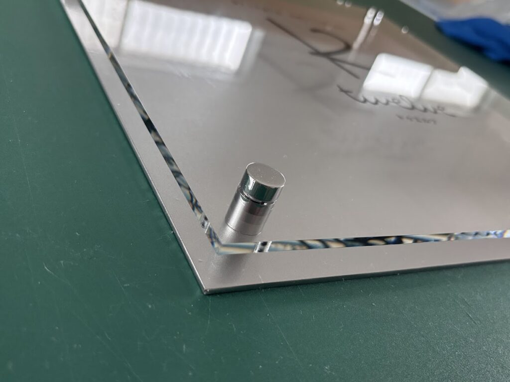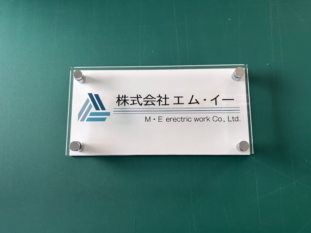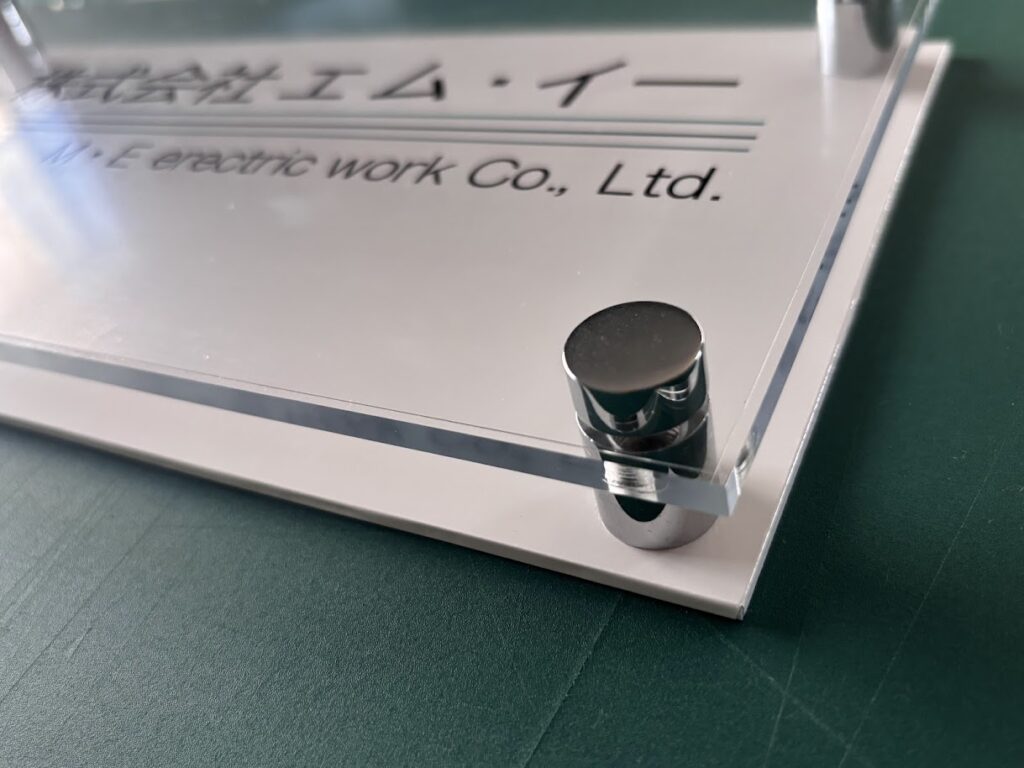 ロゴや文字をクリアに見せるため、透明アクリルの裏面にカッティングシートを貼り付けています。立体感が生まれ、高級感のある仕上がりになります。